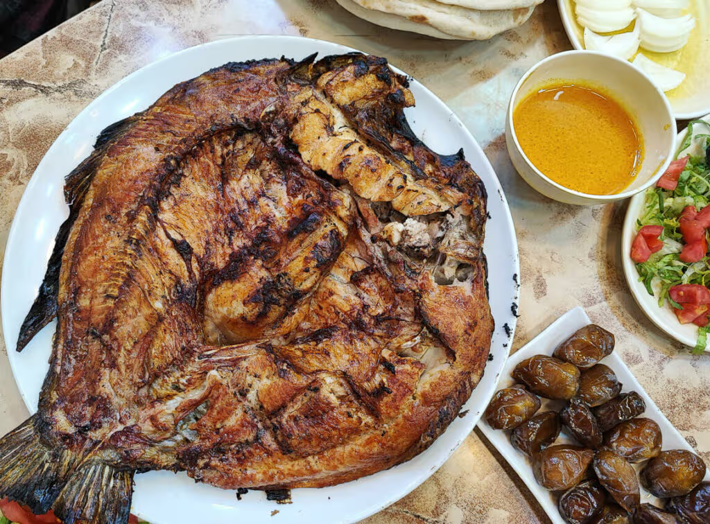 Masgouf – Một món ăn cổ xuất xứ từ vùng Lưỡng Hà gồm cá chép lớn đánh bắt ở sông Tigris hoặc Euphrates, sau đó cá được nướng trong nhiều giờ. Cá trước khi nướng sẽ được ướp trong dầu ô liu, muối mỏ, me và nghệ xay. Đây cũng được coi là một món ăn quốc gia của Iraq.
